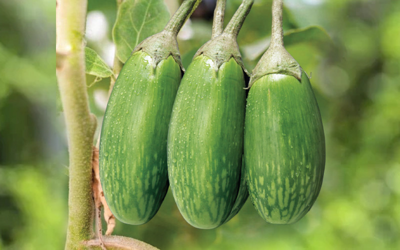Erect plants suitable for early planting. Fruits are oval shaped, light green with white sports. The average weight 160 g. Tolerant to bacterial wilt and fruit and shoot borer.