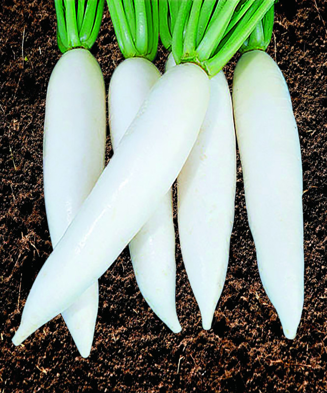 Tropical quick-growing early variety suitable for growing round the year. Roots are white, cylindrical, crispy, and succulent. Two-third of the root grows above the soil.