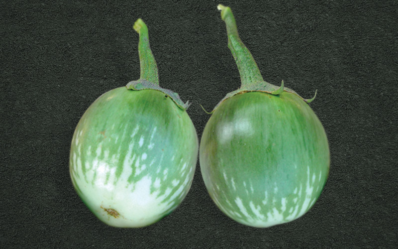 Bushy plants with light spines, grown round the year. Round purplish green fruits with white spots. Tolerant to bacterial wilt and heat.