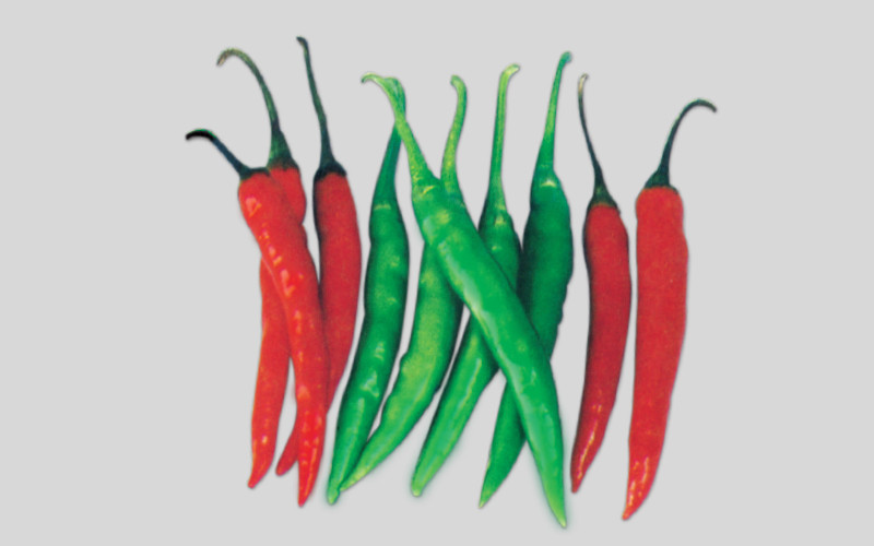 A high yielding emasculated hybrid, moisture and heat tolerant, suitable for round the year production. Vigorous good fruit setting, rtolerant to bacterial wilt and viruses. Fruits are 6-8 cm long, shiny green, straight and high pungent.