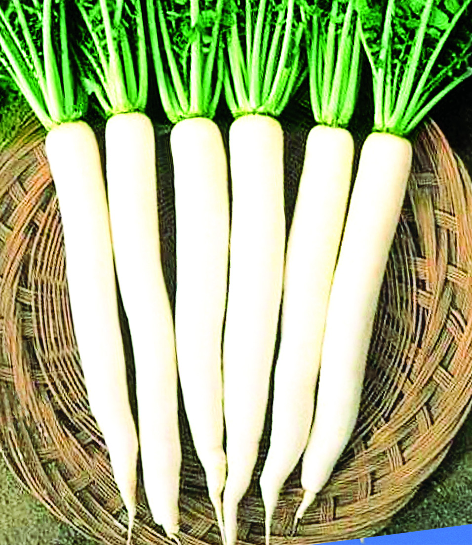 Tropical quick-growing early variety suitable for growing round the year. Roots are white, cylindrical, crispy, and succulent. Two-third of the root grows above the soil.